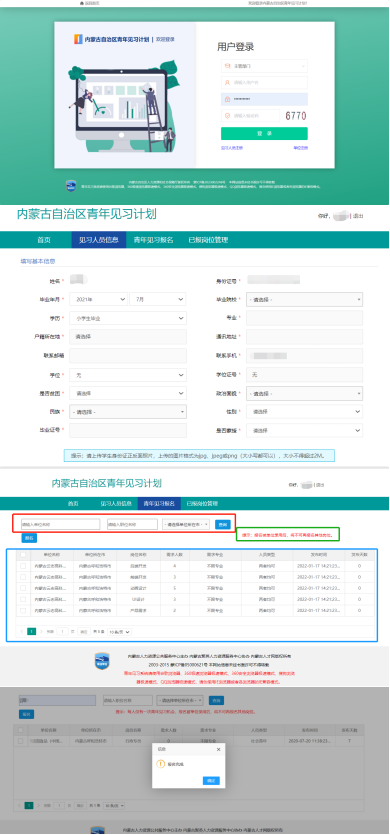 1.訪問http://gx.nmrc.com.cn/#/jianxi/jianxi,選擇見習(xí)人員注冊(cè)登錄(首次登錄需注冊(cè)),進(jìn)入系統(tǒng)后可根據(jù)個(gè)人需要選擇見習(xí)地和見習(xí)單位、崗位,提交后等待單位審核,審核通過后即可按見習(xí)單位要求參與見習(xí)。